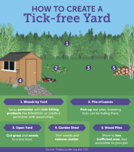 - Remove clutter like woodpiles, brush, leaves, and old, unused gear and equipment. These make for excellent tick hiding spots.